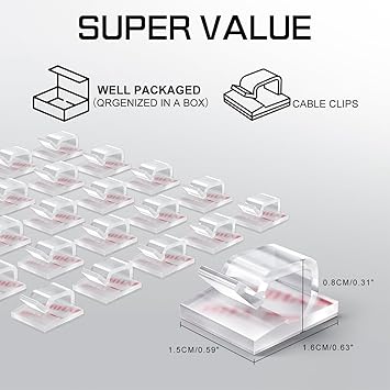 40 PCS WIRE CLIPS PER BAG : Length 14mm/0.55inch, Width 14mm/0.55inch, Height 9mm/0.35inch; Suitable for cables with a diameter (maximum) of 5 mm/0.2 inches, size fits most wires, small size and space saving.