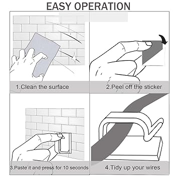 NOTE BEFORE USE : Make sure the mounting surface is clean No dirt, dust, grease and wax. Please do not insert the cable immediately after the cable clip is pasted on the surface of use, The double-sided adhesive pad will reach the strongest adhesion after 24 hours.