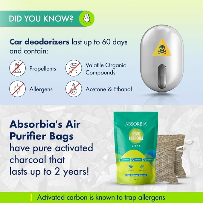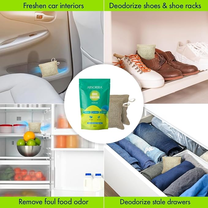 ✅ NATURAL DEODORIZER & DEHUMIDIFIER: The Absorbia Charcoal Bag Versa is a natural deodorizer and dehumidifier, perfect for use in cars, rooms, fridges, shoes, and more. Made with organic jute bag and pure activated charcoal, this product effectively eliminates odors and absorbs excess moisture. It is a reliable solution for maintaining freshness and dryness in various environments.