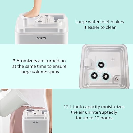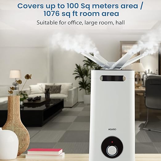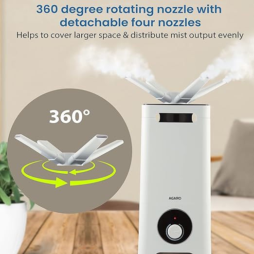 AGARO Grand Cool Mist Ultrasonic Humidifier, 12 Litres, For Bedroom, Home, Office, Detachable Mist Nozzle, Adjustable Mist Output, Super Quiet, Auto Shut Off (White), 33634