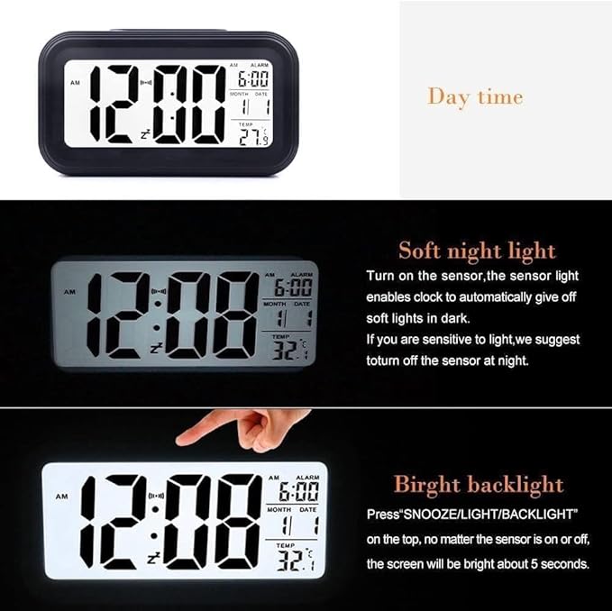 Alarm clock, digital clock, table clock for Students, watch timer for study, Home, Office, Bedroom, kitchen, loud desk alarm clocks for heavy sleepers with Automatic Sensor, Time, Date & Temperature