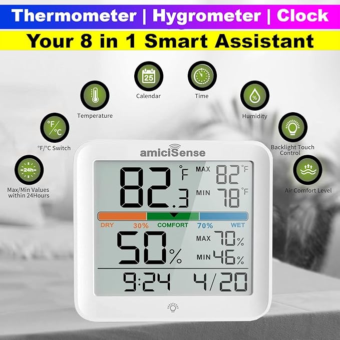 amiciSense Digital Hygrometer Thermometer, AS-55 Temperature and Humidity Monitoring Weather Station with Clock, Plastic, Pack of 1