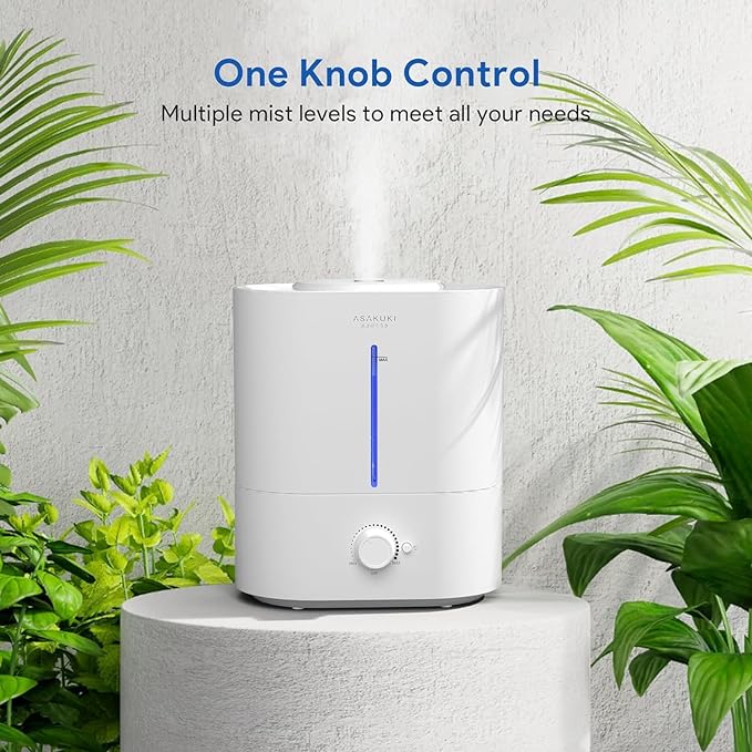 MUCH EASIER FOR USE: Adjust the mist output effortlessly with the user-friendly knob, this room humidifier helps you consistently balance and regulate the humidity indoor for relief from congestion, dry throat, or dry skin.