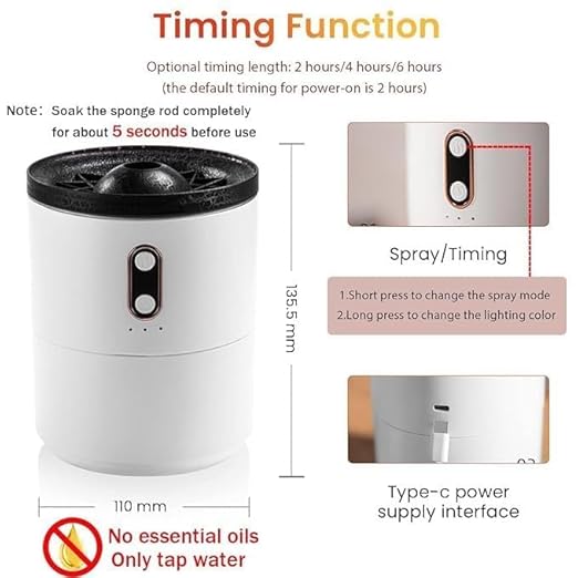 ULTRA-QUIET OPERATION & TIMER: Our Volcano Flame diffuser has an ultra-quiet operating, which does not disturb your work, sleep and exercise. A built-in smart chip allows you to set a timer to humidify 2H ,4H or 6H and initiate an automatic shut-off mode when the water level is too low.