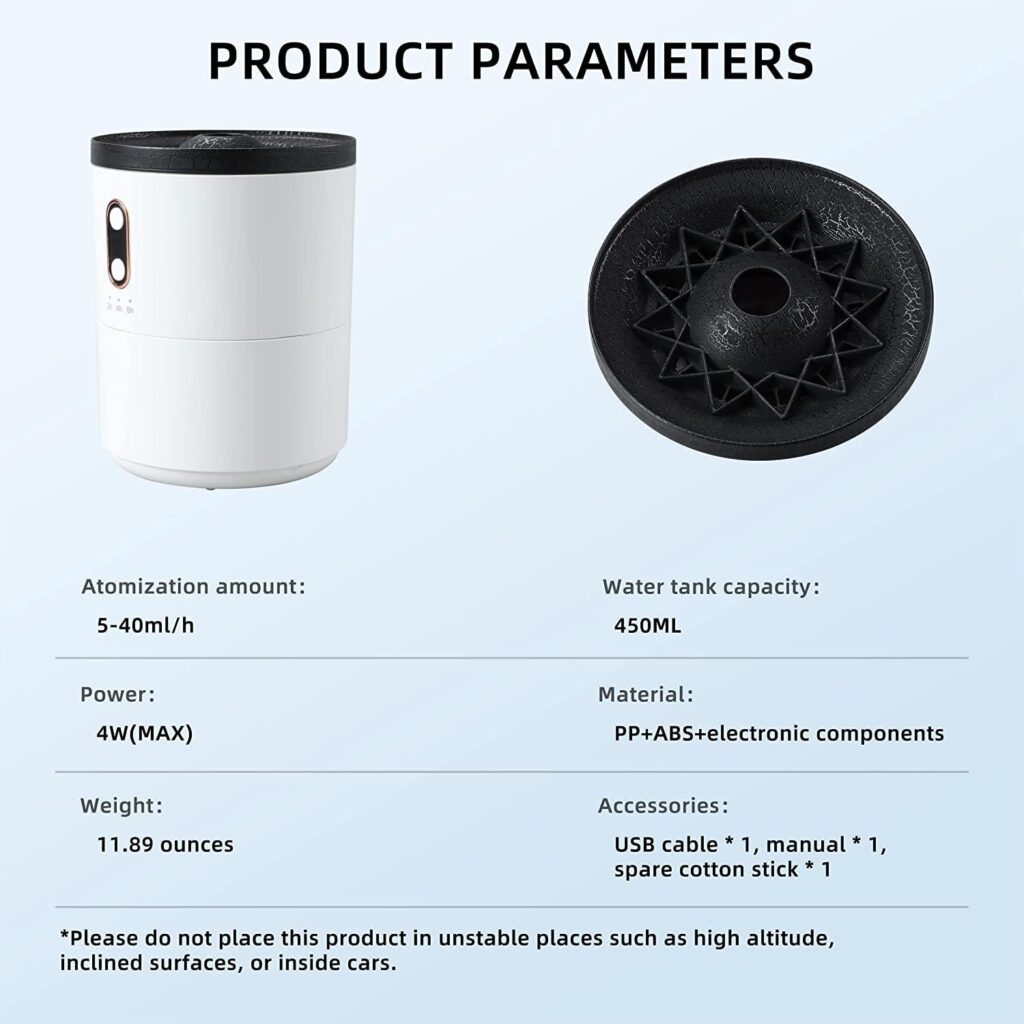 LARGE CAPACITY: Equipped with a large capacity of 450ml water tank, so that the usb humidifier can operate for a long time, without worrying about the humidification effect. You can drop essential oils in the water tank to make the smell more in line with your mood.