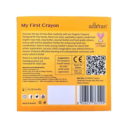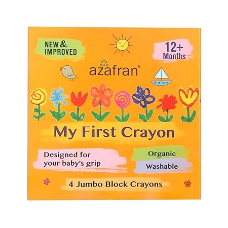 Azafran My First Crayon 4 Jumbo Block Crayons Colors Set for Kids, Baby and Infant Safe, Hypoallergenic, Non-Toxic, Washable, Plant-Based Crayons Colour Set, Ideal Toys for 1 Year Old