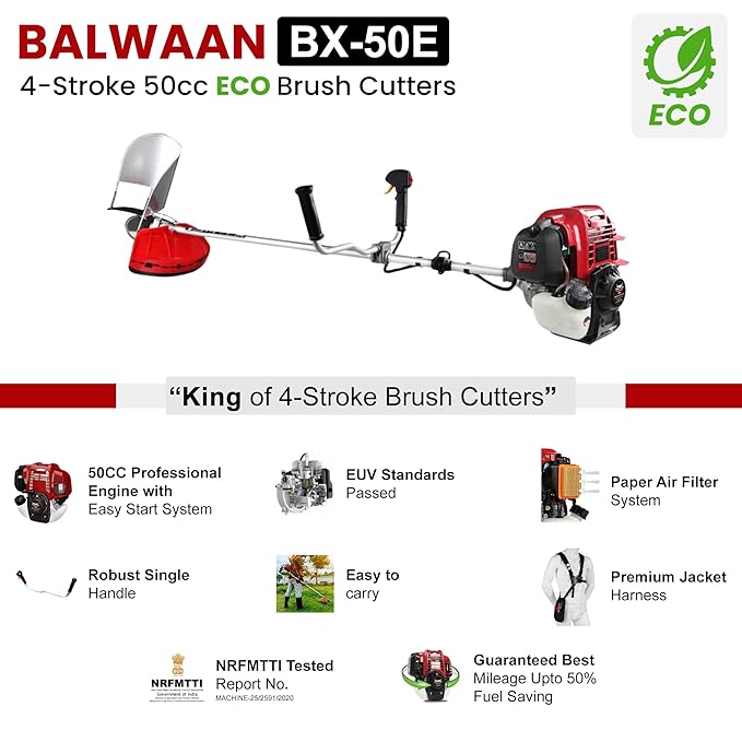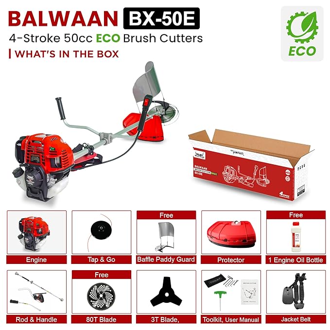 Balwaan Krishi Side Pack Brush Cutter – Eco (BX-50E) | 50cc 4 Stroke Petrol Engine | Comes with Heavy Duty 80 Teeth, 3 Teeth Blades and Tap & Go | for Crop Trimming, Grass Trimming, Lawn Cutting, etc