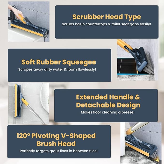 Bathroom Cleaning Brush with Wiper 2 in 1 Tiles Cleaning Brush with Long Handle 120° Rotate Bathroom Floor Cleaning Brush Floor Scrub Bathroom Brush Home (yellloww)