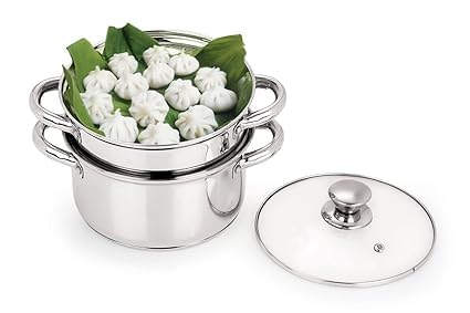 Bigining® Stainless Steel Steamer 2 Tier with Glass Lid 18 cm | 2.5 mm Thick Base | Multi Purpose Momos, Modak Maker Steamer | Induction and Gas Base With Glass Lid (2 Litres)