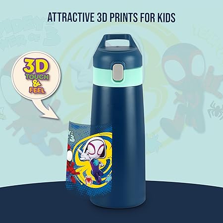 Cello Kidzbee Gulp Web Warriors Thermosteel Flask | 3D Touch & Feel Disney & Marvel Design | Kids Bottle for School & Picnic | 8 Hours Hot & Cold | Leak Proof with Push Button Lid | 490ml | Navy Blue