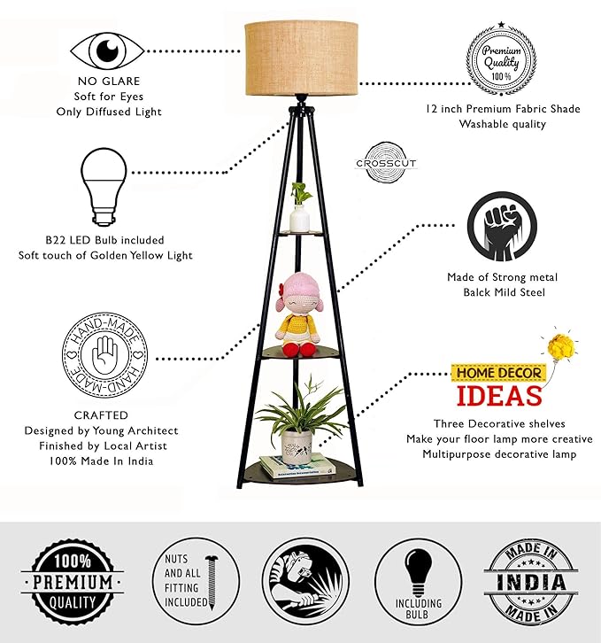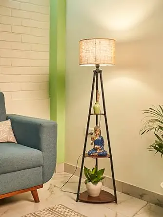 Crosscut Furniture Metal Floor Lamp with 3 Shelves (Brown Jute). LED Bulb Included
