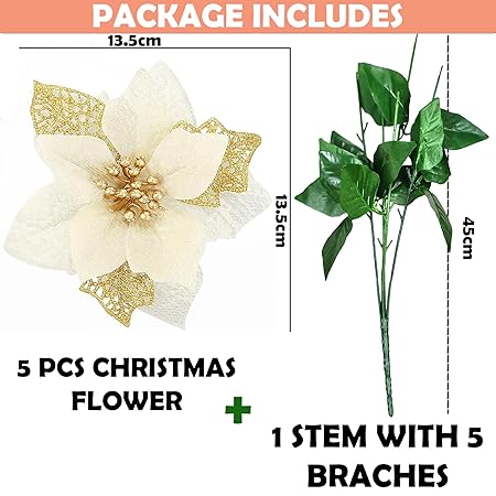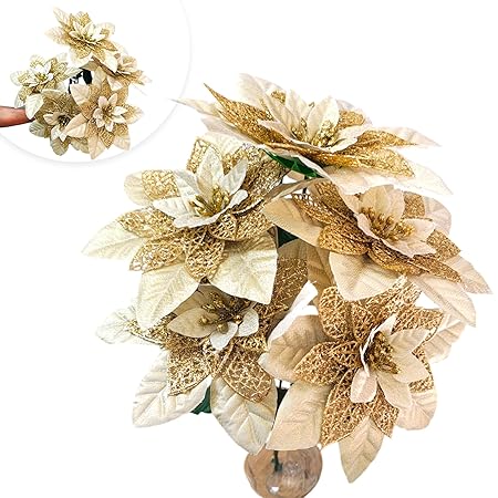 Curated Cart Artificial Gold Poinsettia Flower for Christmas – 1 Stem with 5 Heads (5 Flowers Total) – Flannel Fabric, Realistic Xmas Decor for Tree, Table Centerpieces, Wreaths, Holiday Decoration D2