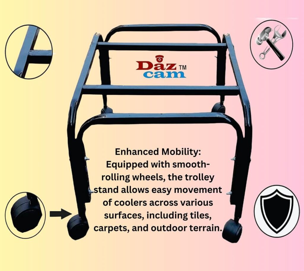 Enhanced Mobility: Equipped with smooth-rolling wheels, the trolley stand allows easy movement of coolers across various surfaces, including tiles, carpets, and outdoor terrain.
