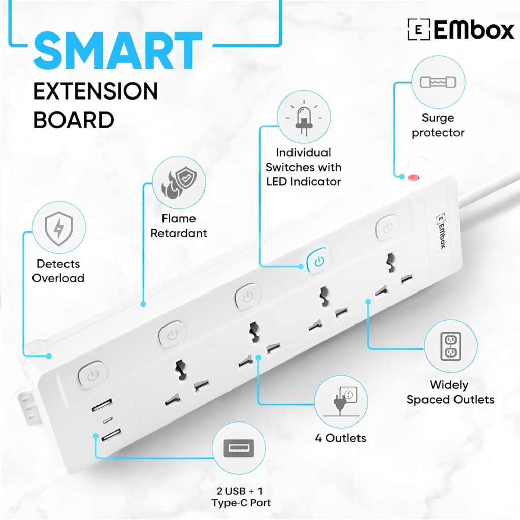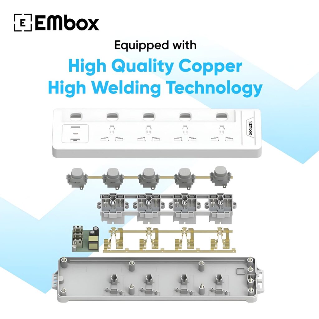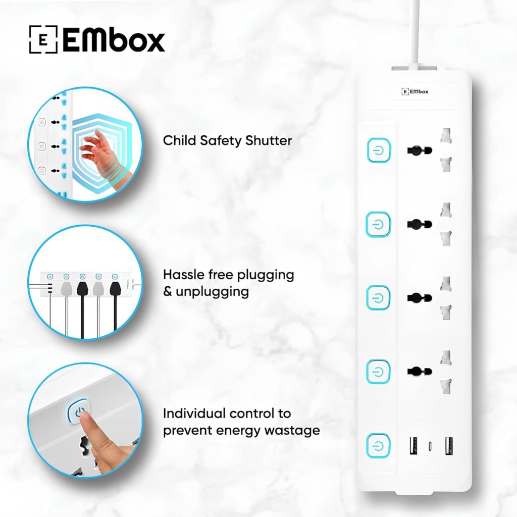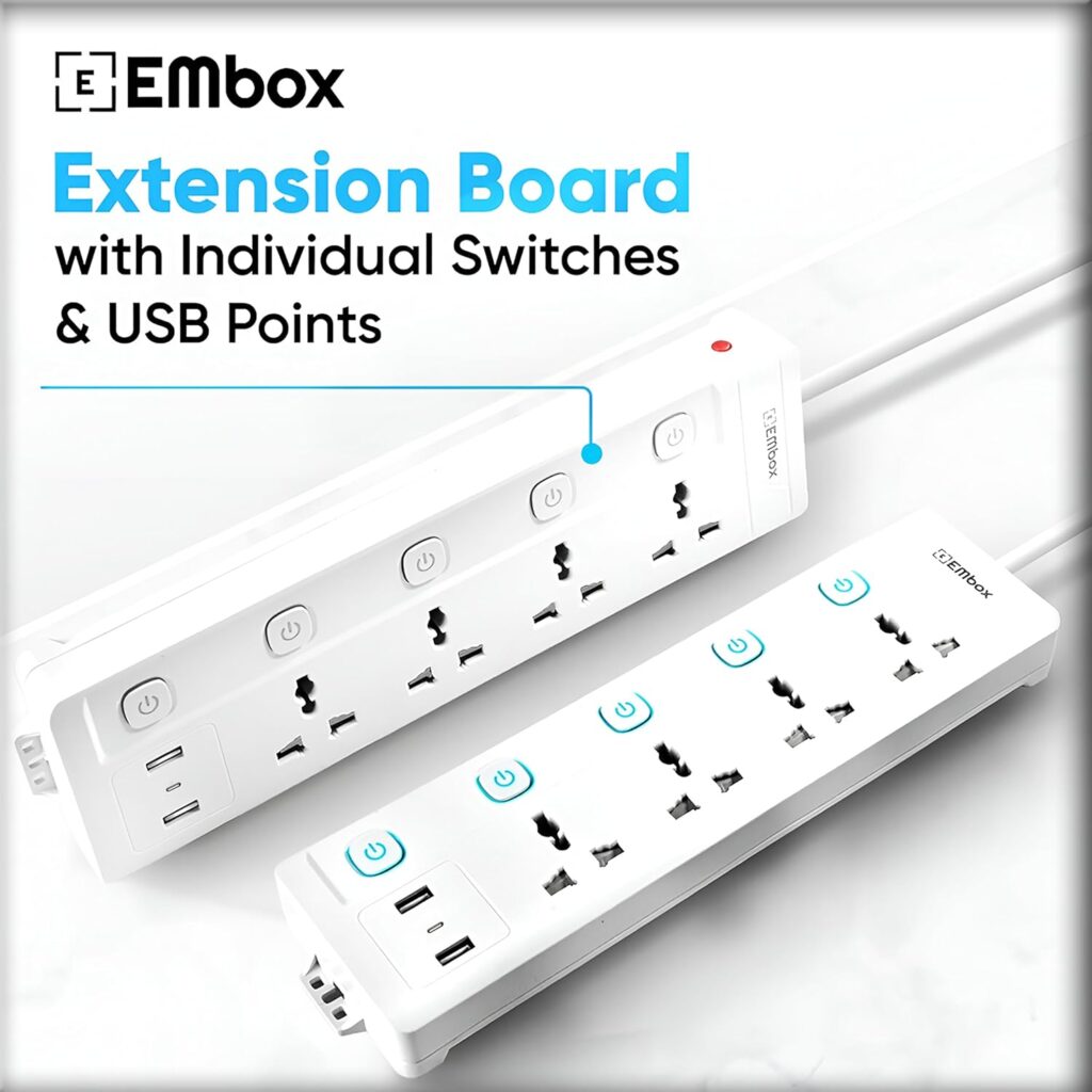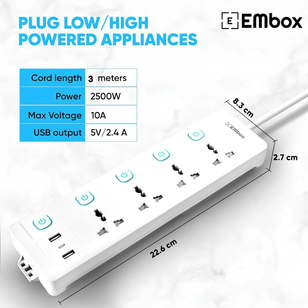 EMBOX 10A Extension Board with USB Port- 4 Universal Sockets and 2 USB 1 Type C (2.4 A) Charging Ports with Indicator, 2500W Heavy Duty Cable, 250 Volts (Type C – USB)