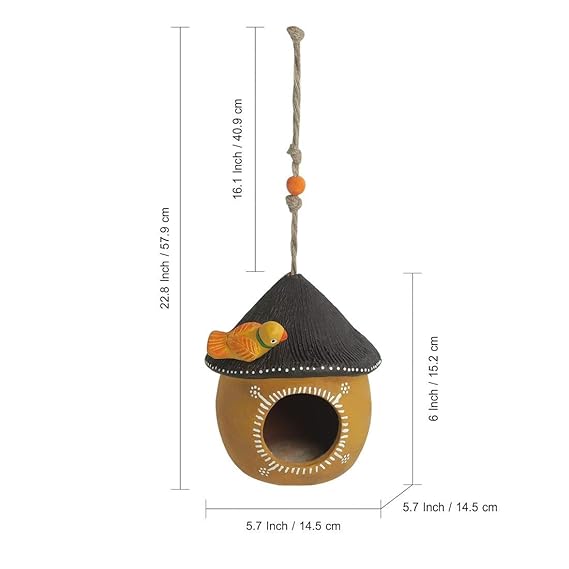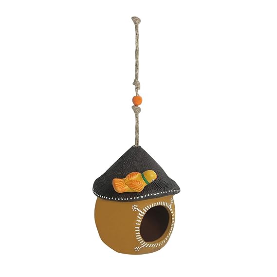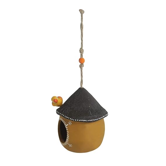 ExclusiveLane ‘Swinging Cottage’ Handmade and Handpainted Terracotta Bird House for Garden Hanging & Balcony (Sand Yellow and Dark Brown, 6 Inch)