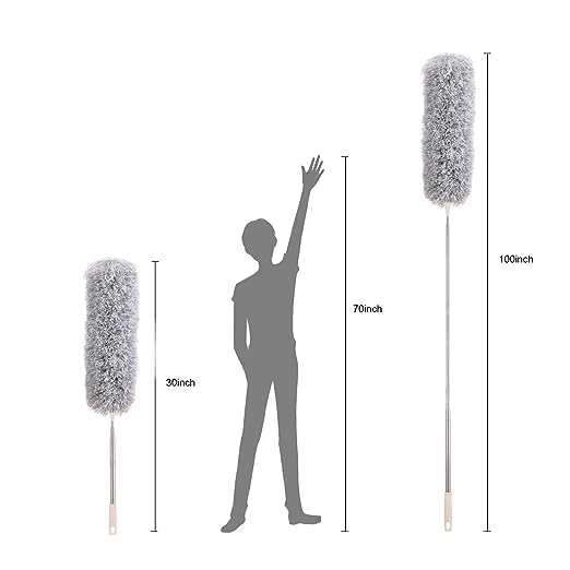 ✅ CAN REACH HIGH CEILINGS: This telescoping microfiber duster with a extra long pole, can reach 100 inches when fully extended, easy to clean ceilings,cobwebs,walls, ceiling fans, and lamps. No more chairs or dangerous ladders to climb on.