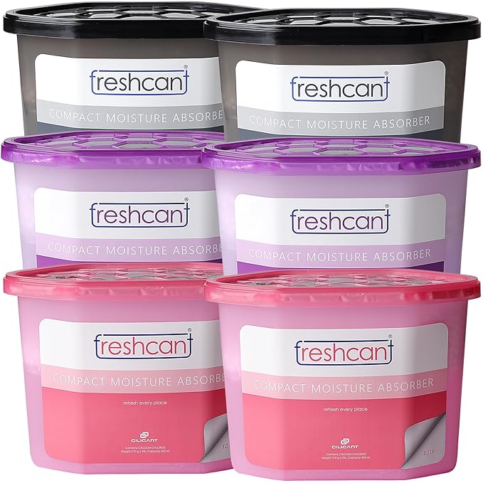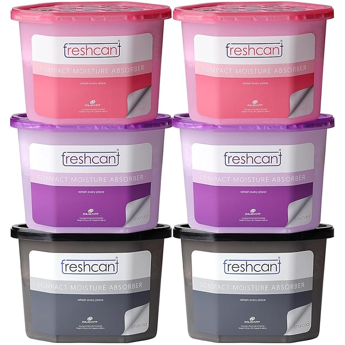 freshcant Compact Moisture Absorber Refresh Every Place, Dehumidifier for Wardrobe/Closets, Storage Compartment, Cupboard, Almirah, Shoe Rack, Bathroom Uses (COMBO PACK OF 6 -2 LAVENDER, 2 ROSE & 2 CHARCOAL)