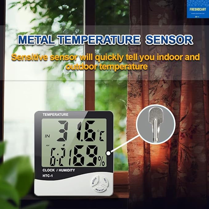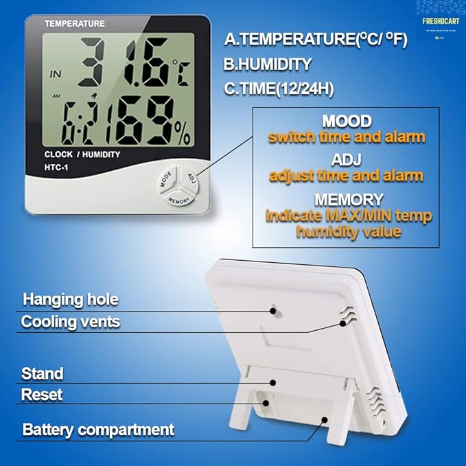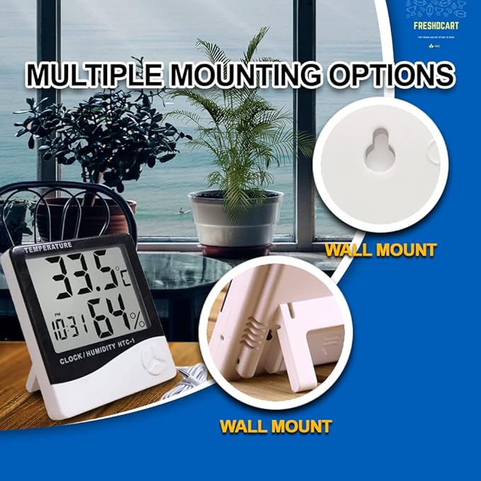FreshDcart Measurement Room Temperature Device Meter Humidity Monitor HTC-1 Incubator with Rest Stand and Accurate Indoor LCD Thermometer Display & wall Mount Clock (white)