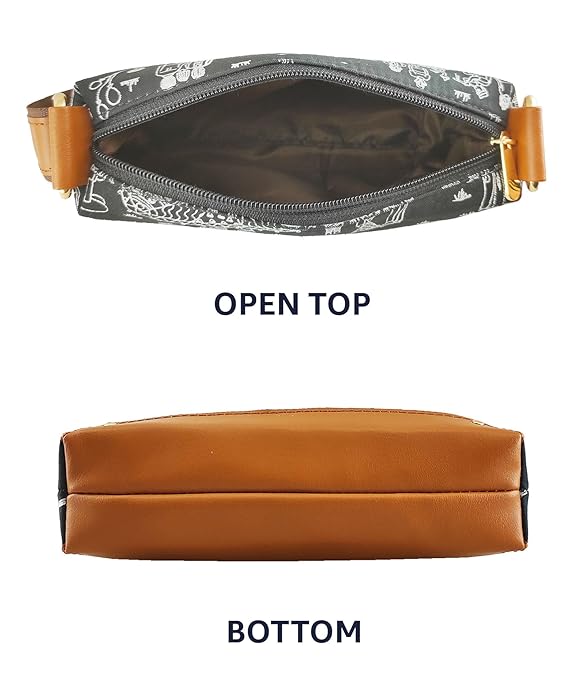 One main compartment inside with zipper closure, Wide and adjustable Leatherette Sling Strap
