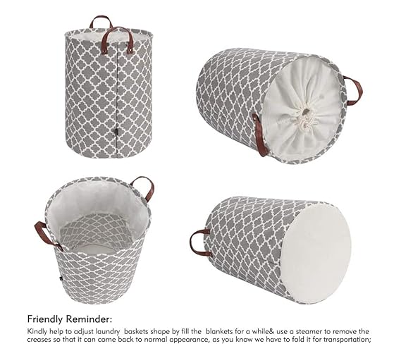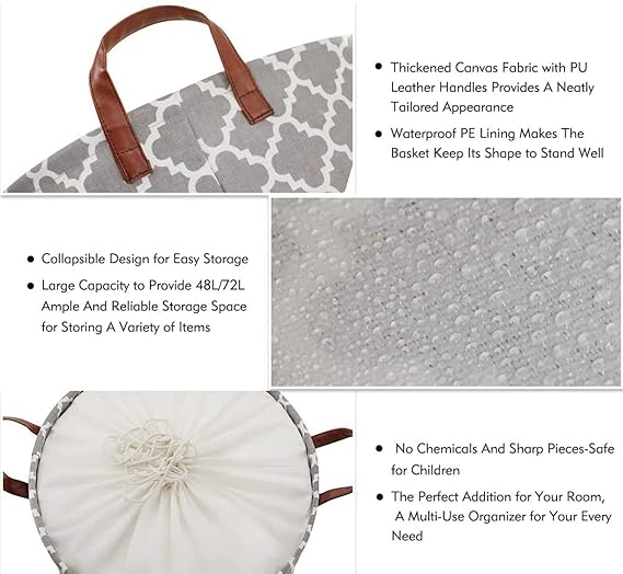 House of Quirk Thickened X-Large 72L Sized Laundry Basket with Durable Leather Handle, Drawstring Round Linen Collapsible Storage Basket, Dirty Clothes Hamper for Bedroom(Grey Diamond)