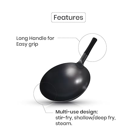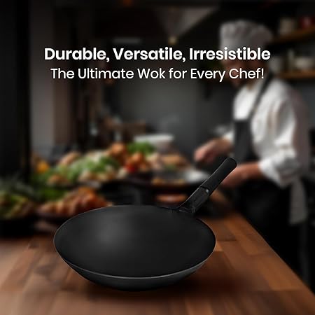 High-Quality Carbon Steel Construction: Made from premium carbon steel, this wok heats up quickly and evenly, delivering restaurant-quality results with every use. Its durable structure ensures long-lasting performance, making it ideal for both home cooks and professionals.