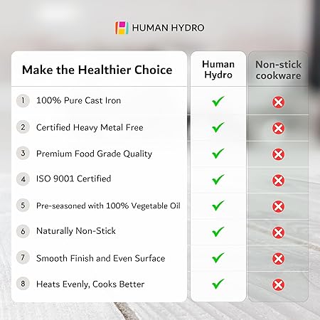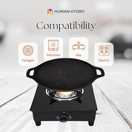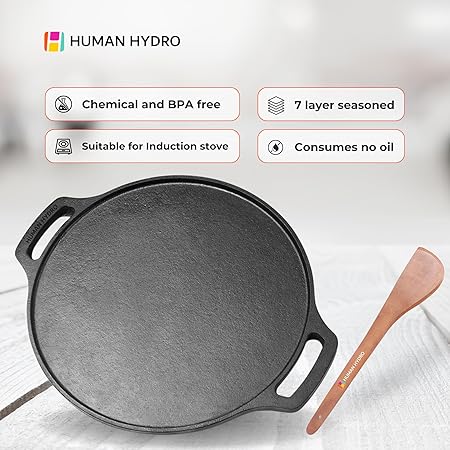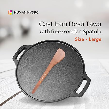 FEATHER-LIGHT CAST IRON TAWA FOR EASY HANDLING – Human Hydro’s cast iron dosa tawa is expertly crafted to be lightweight yet sturdy, ensuring easy handling for making perfect dosa, chilla, omelets, roti, and more. Ideal for daily use, unlike heavier tawas.