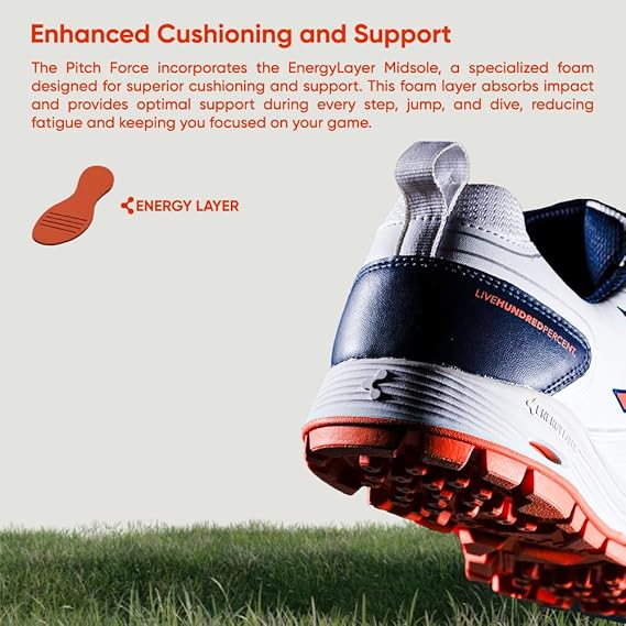 EnergyLayer Midsole : The Pitch Force incorporates the EnergyLayer Midsole, a specialized foam designed for superior cushioning and support. This foam layer absorbs impact and provides optimal support during every step, jump, and dive, reducing fatigue and keeping you focused on your game.