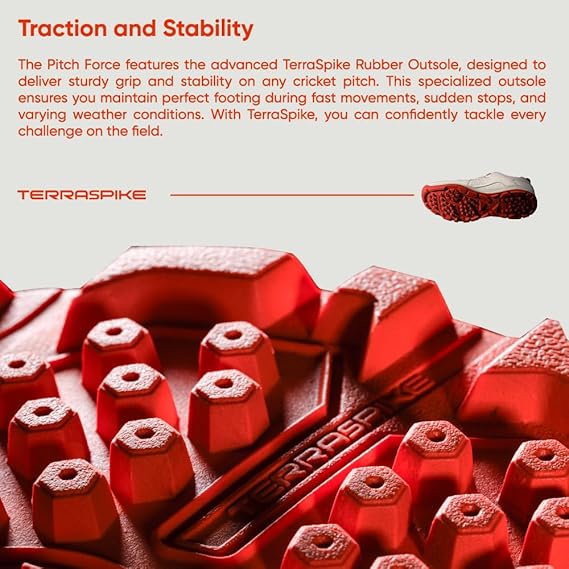 TerraSpike Rubber Outsole : The Pitch Force features the advanced TerraSpike Rubber Outsole, designed to deliver sturdy grip and stability on any cricket pitch. This specialized outsole ensures you maintain perfect footing during fast movements, sudden stops, and varying weather conditions. With TerraSpike, you can confidently tackle every challenge on the field.