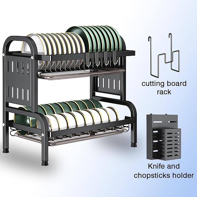 IBELL DR242 Dish Drying Rack, 2-Tier Bartan Stand/Drainer Shelf/Kitchen Organizer/Counter for Utensils Storage (Black)