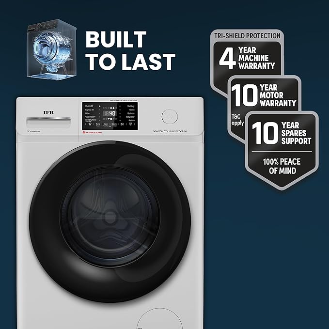 TRISHIELD PROTECTION : IFB washers come with India’s best warranty 4 years machine warranty + 10 years Motor Warranty + 10 years Spares Support