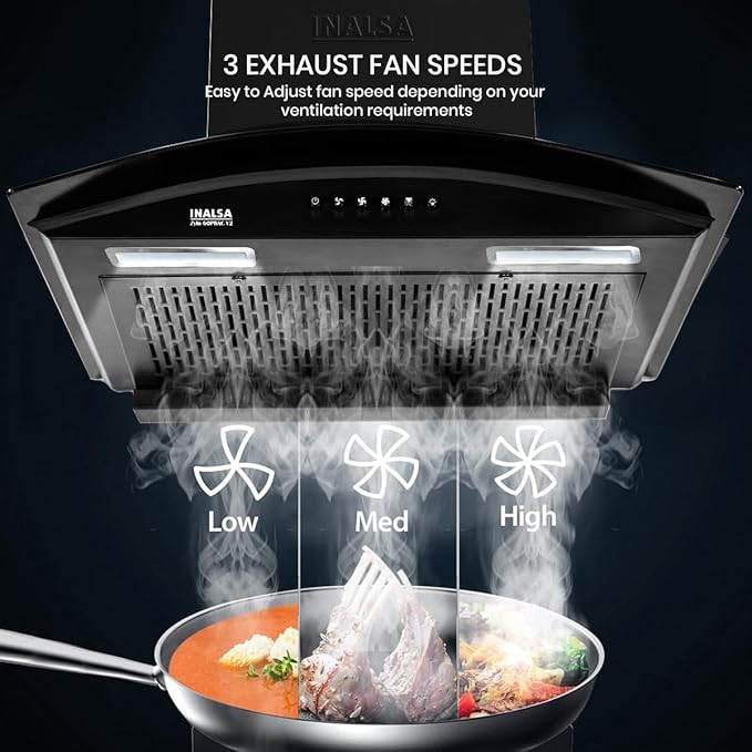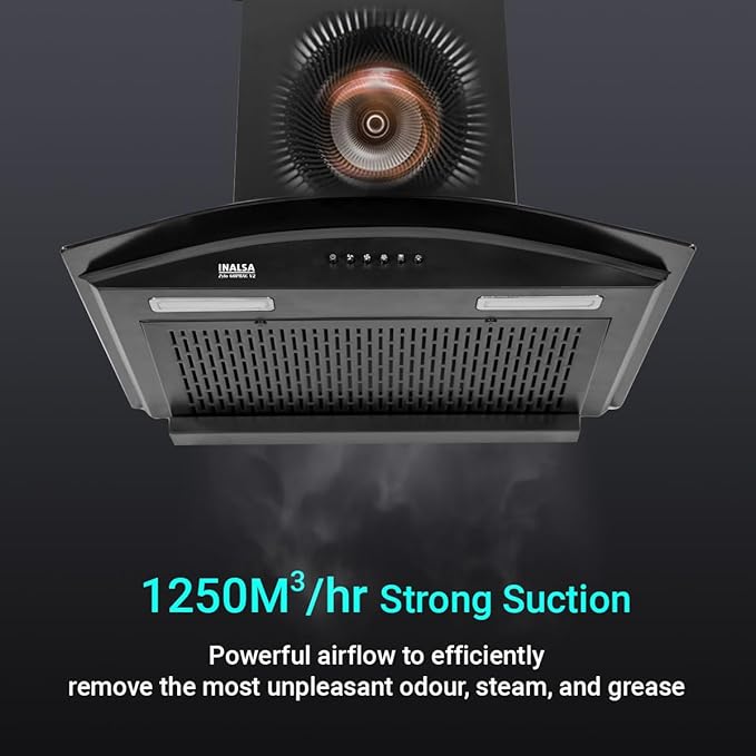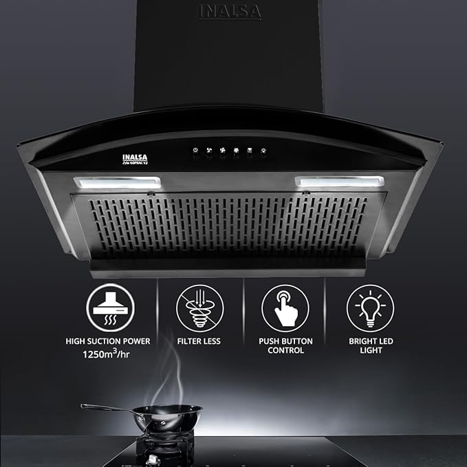INALSA Chimney for Kitchen AutoClean-60 cm Filterless |1250 m³/hr Suction|Curved Glass|7 Year Warranty on Motor|Oil Collector| Push Button Control|Dual LED Lamps|Black-Zylo 60PBAC V2