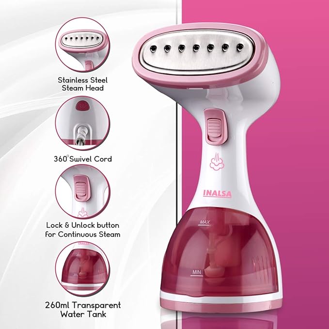 INALSA Garment Steamer for Clothes, Steam Iron Press – Vertical & Horizontal Steaming up to 22g/min, 1200 Watt, 260 ml Water tank & 30 sec Fast Heating (Steamax)