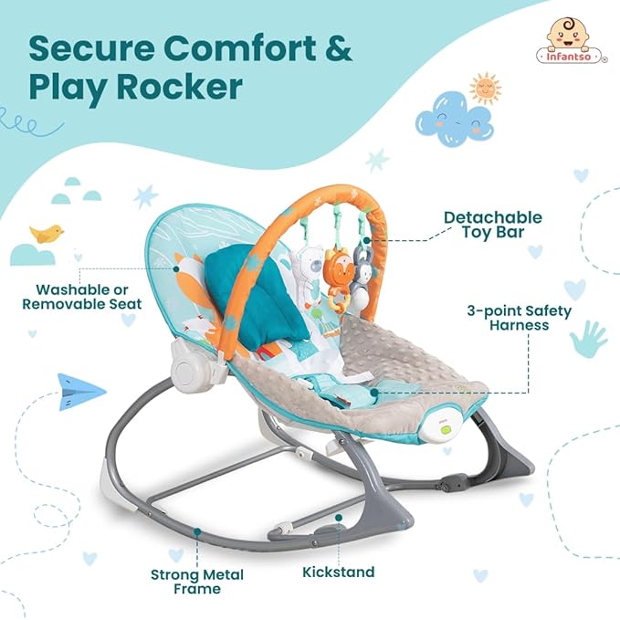 Detachable Toy Bar: Enhancing playtime and versatility, Infantso’s baby rocker & bouncer is equipped with a detachable toy bar. Parents can easily attach or remove engaging toys, stimulating the baby’s senses and promoting cognitive development. The detachable feature also facilitates convenient cleaning and storage, ensuring a hassle-free experience for both parents and baby.