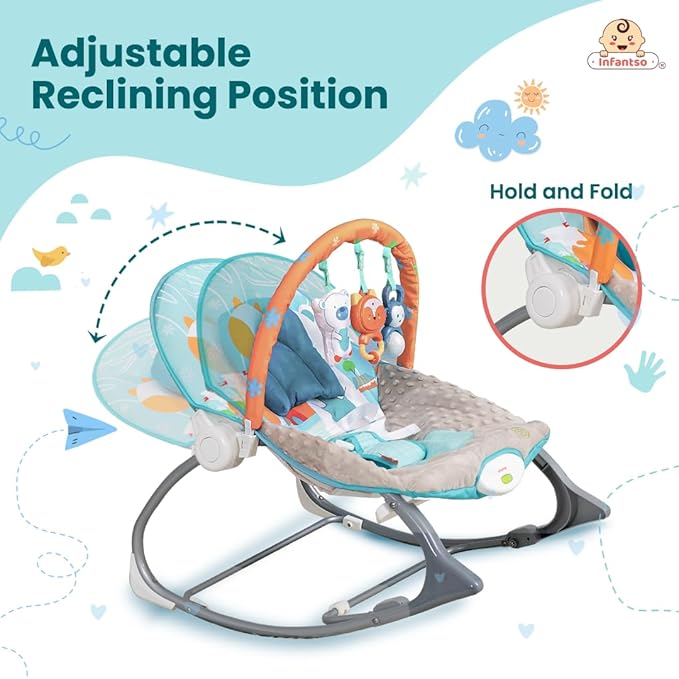Calming Vibrations for Comfort: Creating a soothing environment akin to a mother’s embrace, Infantso’s baby rocker includes a vibration box. The gentle vibrations help calm and relax the baby, providing comfort and reassurance. By simulating the feeling of being snuggled in a mother’s lap, the calming vibrations promote relaxation and contentment, making it an ideal companion for naptime or playtime.
