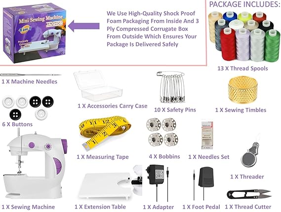 【 SEWING MACHINE FOR HOME USE Accessories 】 1 x Sewing Machine, 1 x Expansion Table, 4 x Metal Bobbins, 1 x Foot Pedal, 3 x Needle, 1 x Needle Threader, 1 x Adapter, 1 X Fully Loaded Sewing Kit With All Accessories