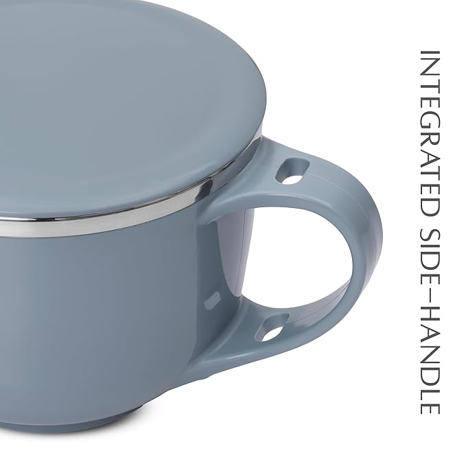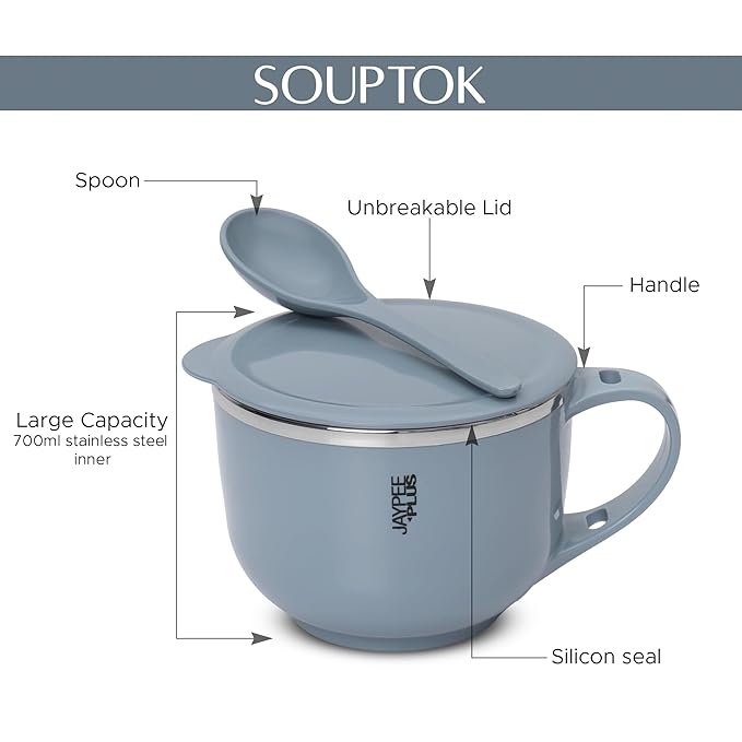 These Souptok noodle bowl soup bowl with spoon is designed with Mirror Finished Inner Stainless Steel and Pastels outside with special Puf Coating that keeps content Warm for many hours.