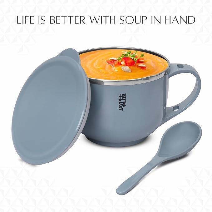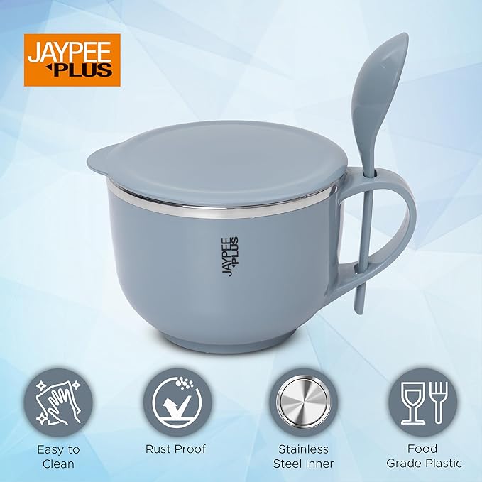 Jaypee Plus Stainless Steel Soup Bowl with Lid & Spoon Holder Souptok, Maggi Bowl Noodles Pasta Bowl Mug for Milk, Best Diwali Gift, Mug for Kids, Girls, Boys, Birthday, Blue