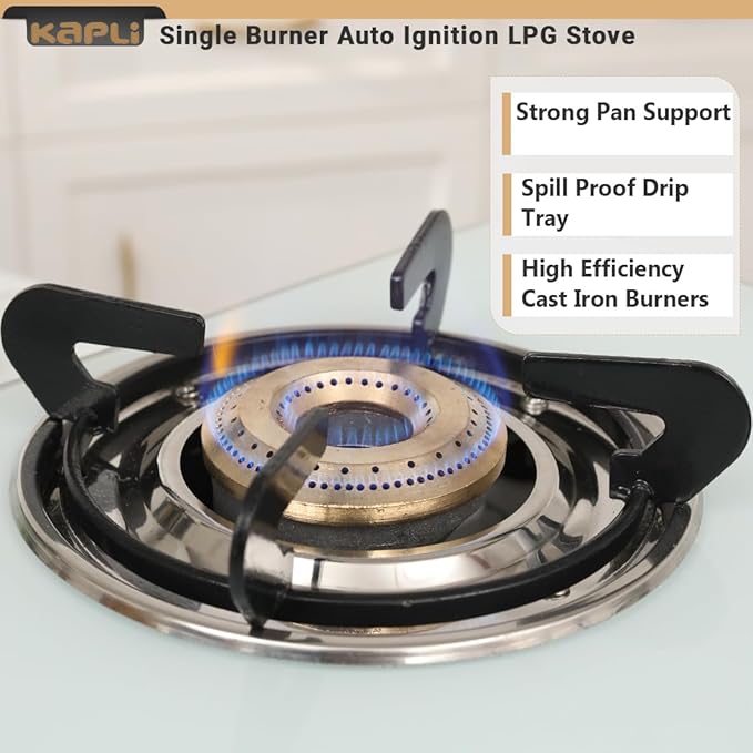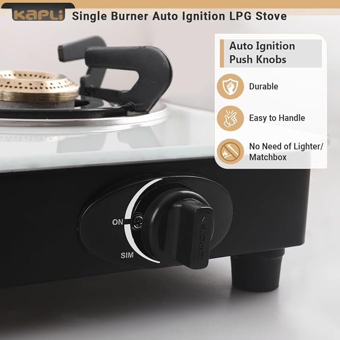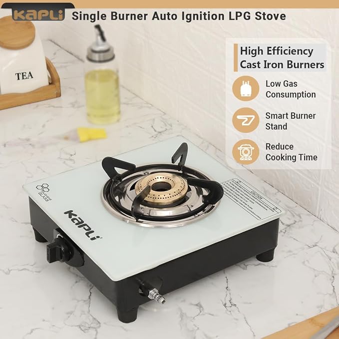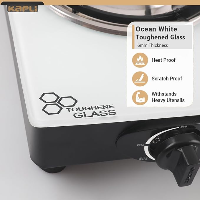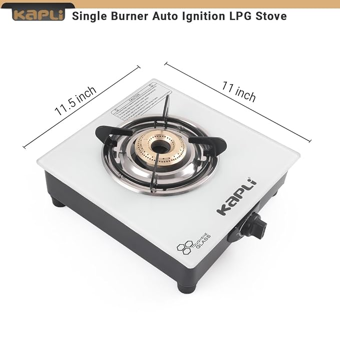 Kapli 1 Burner Auto Ignition with Toughened Glass Gas Stove Cooktop | High Efficiency Brass 1 Burner| 1 Year General Warranty| Door Step Service |Scratch Proof |White