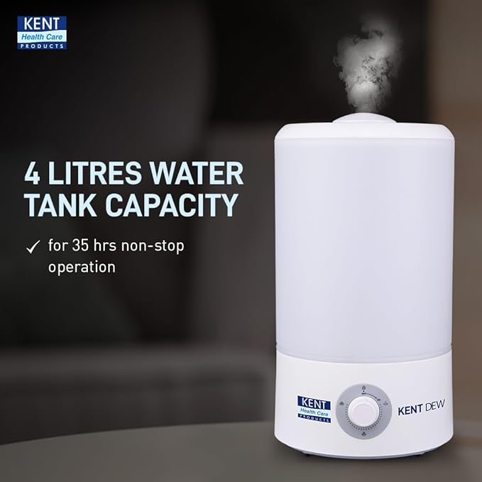 KENT Dew Humidifier with Ultrasonic Mist 4L | Eliminates Dryness Caused by AC’s & Room Heater | UV LED Light Kills Bacteria & Viruses | Keeps Room Cool in Summer | No Water Droplets | 25W | White