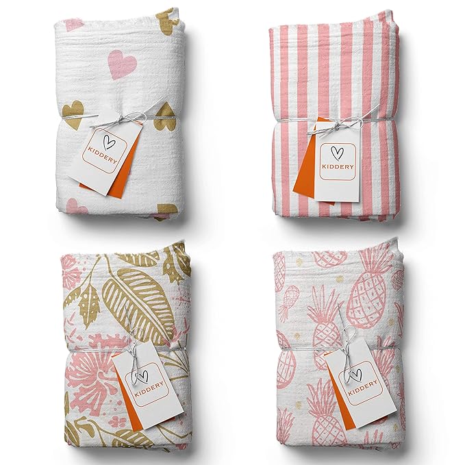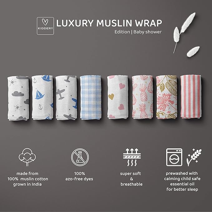 Kiddery Swaddle Wraps | Set of 8 | 100% Muslin Cotton | Breathable | Soft | Nursing Cover | Stroller Cover | Essential Summer Cover | Newborn | 0-12 Months | Unisex