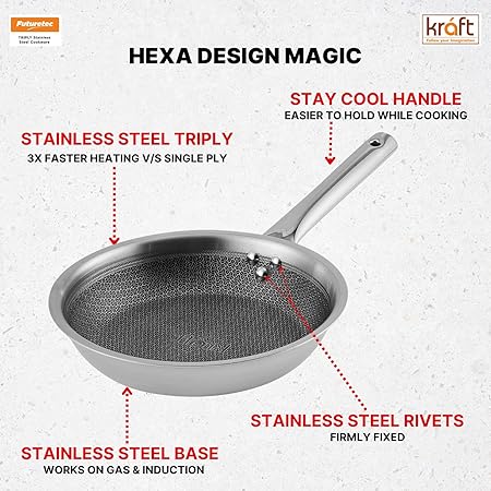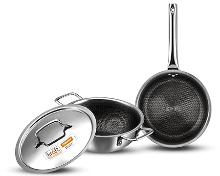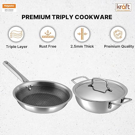 Kraft Futuretec Pro Stick Free Triply Stainless Steel Cookware Combo Set of 3 Pc | Kadai 2.4 L (22cm), Frypan 1.6 L (22cm) with Common Lid, Tri ply Induction, Gas cookware – 5 Year Warranty
