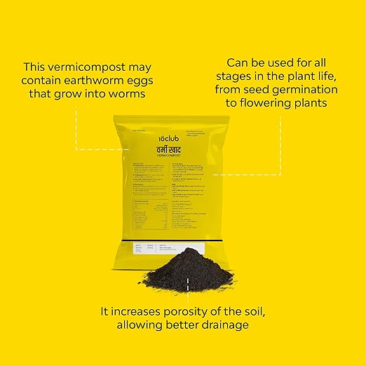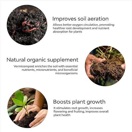 Why use Vermicompost: Increases nutrients in soil. increases water storage holding capacity and grow plants with less water, improves aeration; Easy to store, easy to use, sustainable and earth-friendly, pure earthworm castings; High organic carbon content, absence of foul odour, non-toxic