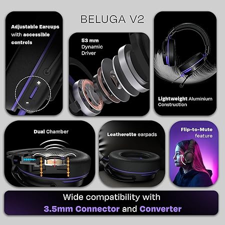 Kreo Beluga V2 Wired Gaming Headset, 50mm Oraphene Drivers, Duel Chamber, Flip to Mute Mic, Memory Foam Earpads, Lightweight Aluminum Huikt, PC, PS4, PSS Mobile (Beluge V2 with Converter)