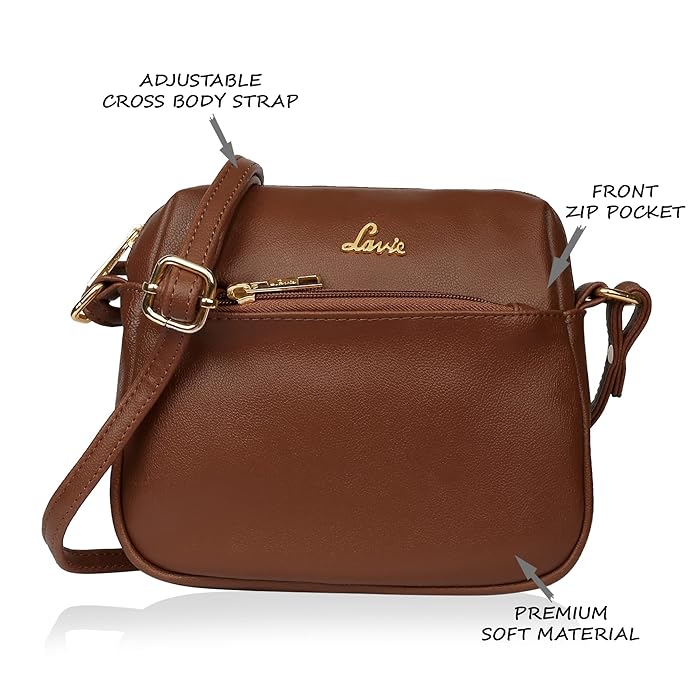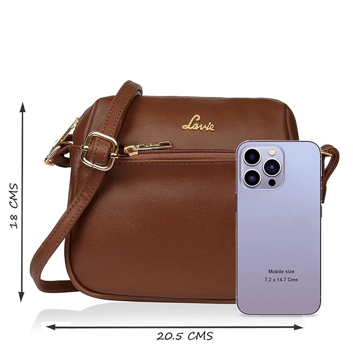 About this item Made in premium quality faux leather – 20.5 cms Length X 6 cms Width X 18 cms Height 1 spacious main compartment, 1 front zip pocket and 1 back zip pocket Stylish sling bag with pebbled texture Classy sling bag to make a statement Top zip closure with adjustable sling strap