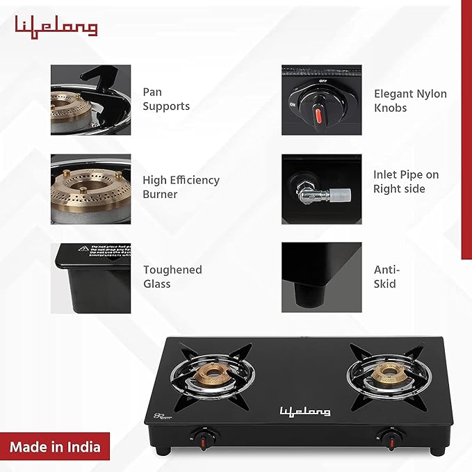 Lifelong 2 Burner Gas Stove Top for Kitchen – Automatic Ignition Cooktop Modern Glass Stove for Modular Kitchen, ISI Certified & Compatible with LPG – 1 Year Manufacturer’s (Black, LLGS912)
