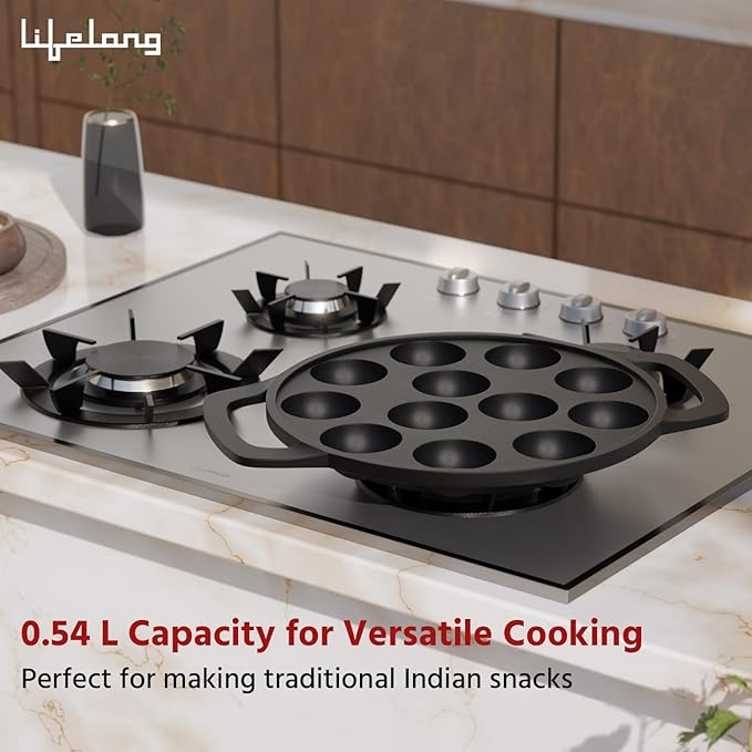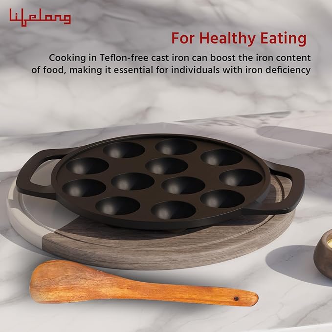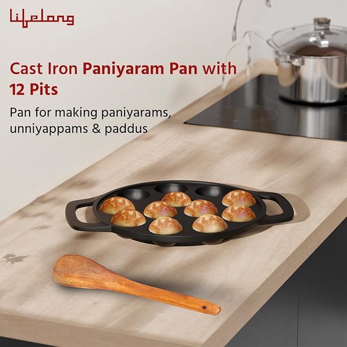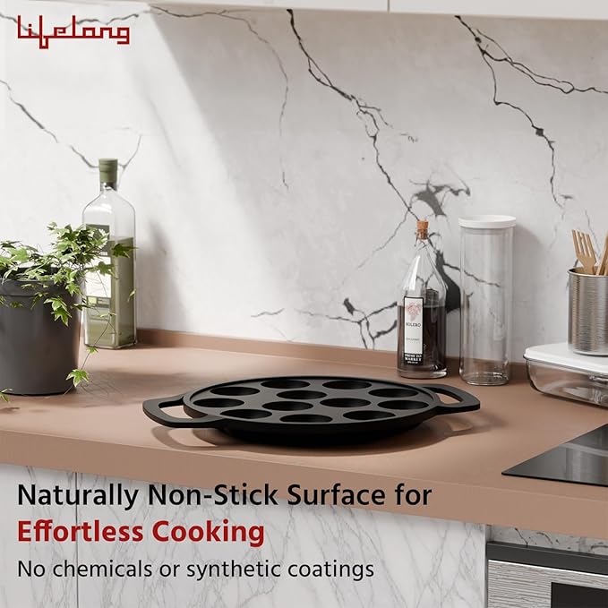 Lifelong Cast Iron Paniyaram Pan 12 Pits | 0.54 L, 2kg | Pre-Seasoned Appam Pan, Unniyappam Chatty, Paddu Maker | Large Non-Toxic Cookware, Non-Stick & Teflon Free, Durable for Easy Cooking & Cleaning