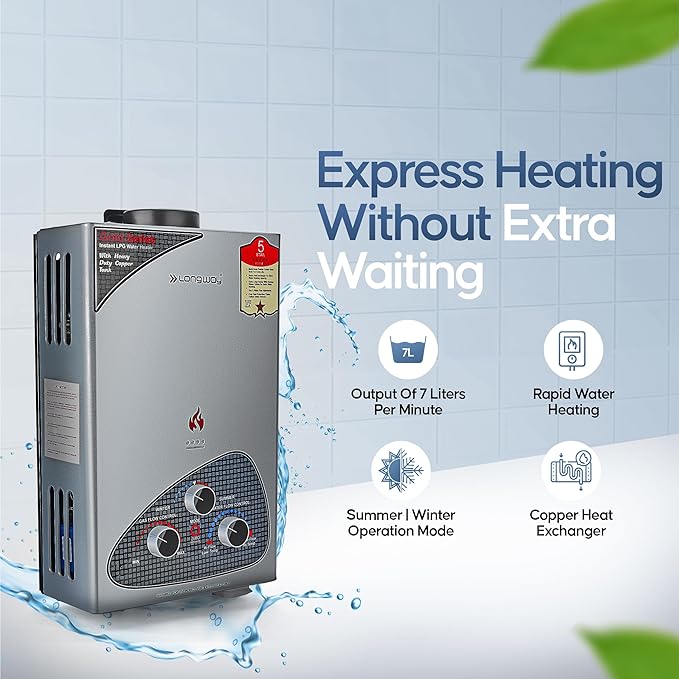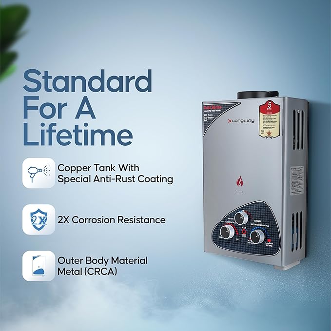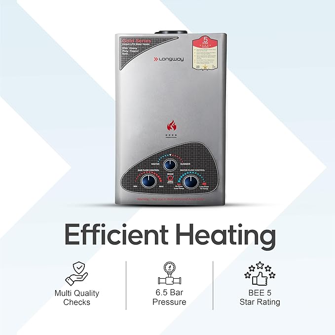 Longway Xolo Gold Dlx 7 Ltr 5 Star Rated Automatic Gas Water Heater for Home, Instant Water Geyser, Gas Geyser with Multiple Safety System & Anti-Rust Coating | 1-Year Warranty | Silver, 7 Ltr
