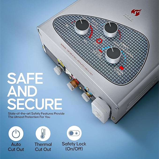 Product Features : Rapid Water heating, output of 7 Liters per minute. Summer/ Winter Operation Mode. Gas leakage protection to ensure safety at all times, Thermal cutout, Safety lock (on/off), Auto Off-Timer. Normal operation even in low pressure areas.