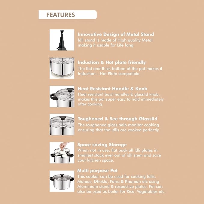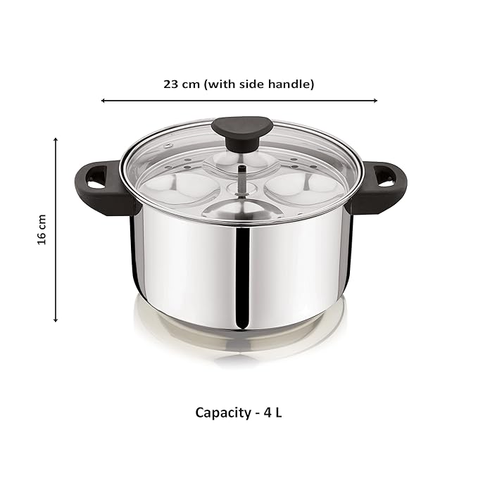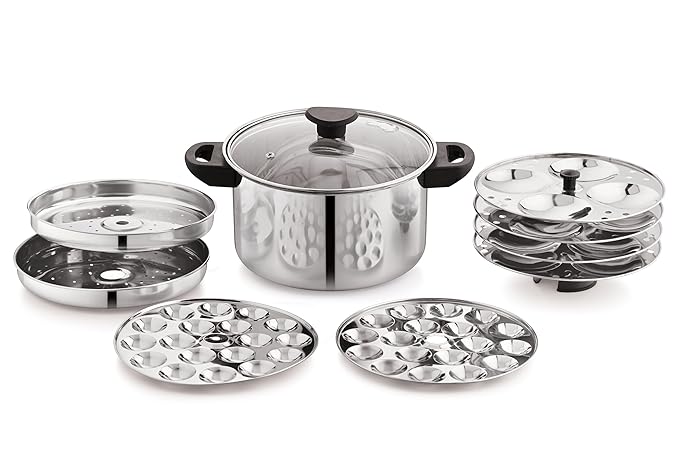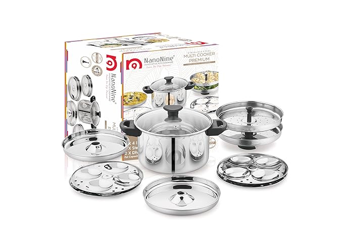 NanoNine 11 pc Multi Cooker | Premium Stainless Steel Idli Cooker | Dhokla Maker | Momo Maker | Glass Lid Steamer | 4 x 4 Idli Plates, 2 Dhokla Plates, 2 Steamer Plates, 4 Liter, Silver