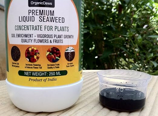 OrganicDews Liquid Seaweed Concentrate for Plants 250 ml with Measuring Cup 25 ml Fertilizer for All Indoor and Outdoor Plants 250 ml